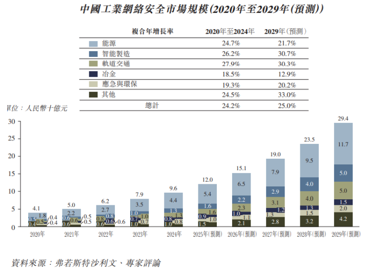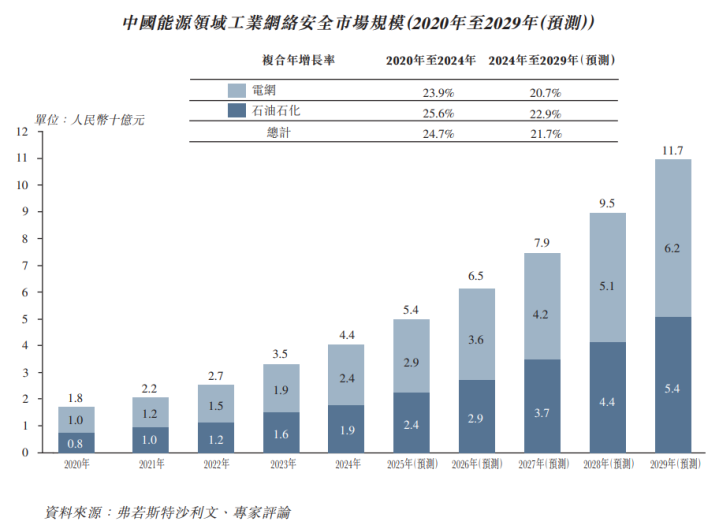 中国能源领域的工业网络安全市场涵盖电网与石油石化两个子行业,持续保持扩张态势。总体而言,2020年的市场规模为人民币18亿元,于2024年飙升至人民币44亿元,2020年至2024年的复合年增长率为24.7%,预计到2029年将达到人民币117亿元,2024年至2029年的复合年增长率为21.7%。具体而言,于2020年及2024年,电网行业的市场规模分别为人民币10亿元及人民币24亿元,预计到2029年将达到人民币62亿元,2024年至2029年的复合年增长率为20.7%;而石油石化行业的增长表现更为突出,其市场规模从2020年的人民币8亿元增至2024年的人民币19亿元,2020年至2024年的复合年增长率为25.6%,预计到2029年将达到人民币54亿元。2024年至2029年的复合年增长率为22.9%。
