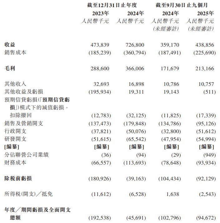 于2023年度、2024年度、2024年截至9月30日止九个月、2025年截至9月30日止九个月,公司录得年度╱期间亏损及全面开支总额分别约1.93亿元、4569.1万元、1.03亿元、9467.2万元。