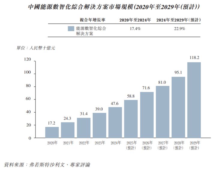 中国能源数智化综合解决方案的市场规模已从2020年的人民币172亿元稳步增长至2024年的人民币476亿元,2020年至2024年的复合年增长率为17.4%,预计到2029年将达到人民币1,182亿元,2024年至2029年的复合年增长率为22.9%,显示出强劲的增长势头。该趋势不仅反映了政策引导和市场需求的双重驱动,也凸显了能源企业迫切追求降低成本、提高运营效率、实现绿色低碳转型和智能运营的决心。