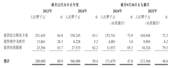 于2023年度、2024年度、2024年截至9月30日止九个月、2025年截至9月30日止九个月,公司录得毛利分别约2.89亿元、3.66亿元、1.72亿元、2.13亿元,对应毛利率分别为60.9%、50.4%、47.8%、48.6%。